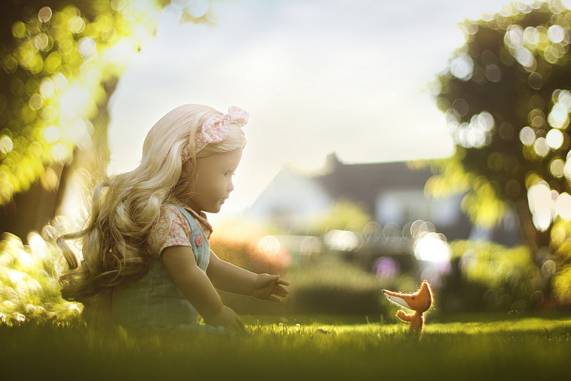 Perspective is extremely important when attempting photography of something so much smaller than our perceived world. Jimmy, Cozi's little fox, appears to be looking up at her in a slightly realistic way. I placed the camera as low as I could to freshen the perspective and provide a picture from his point of view. It certainly helps when you want to tell a story with inanimate objects!